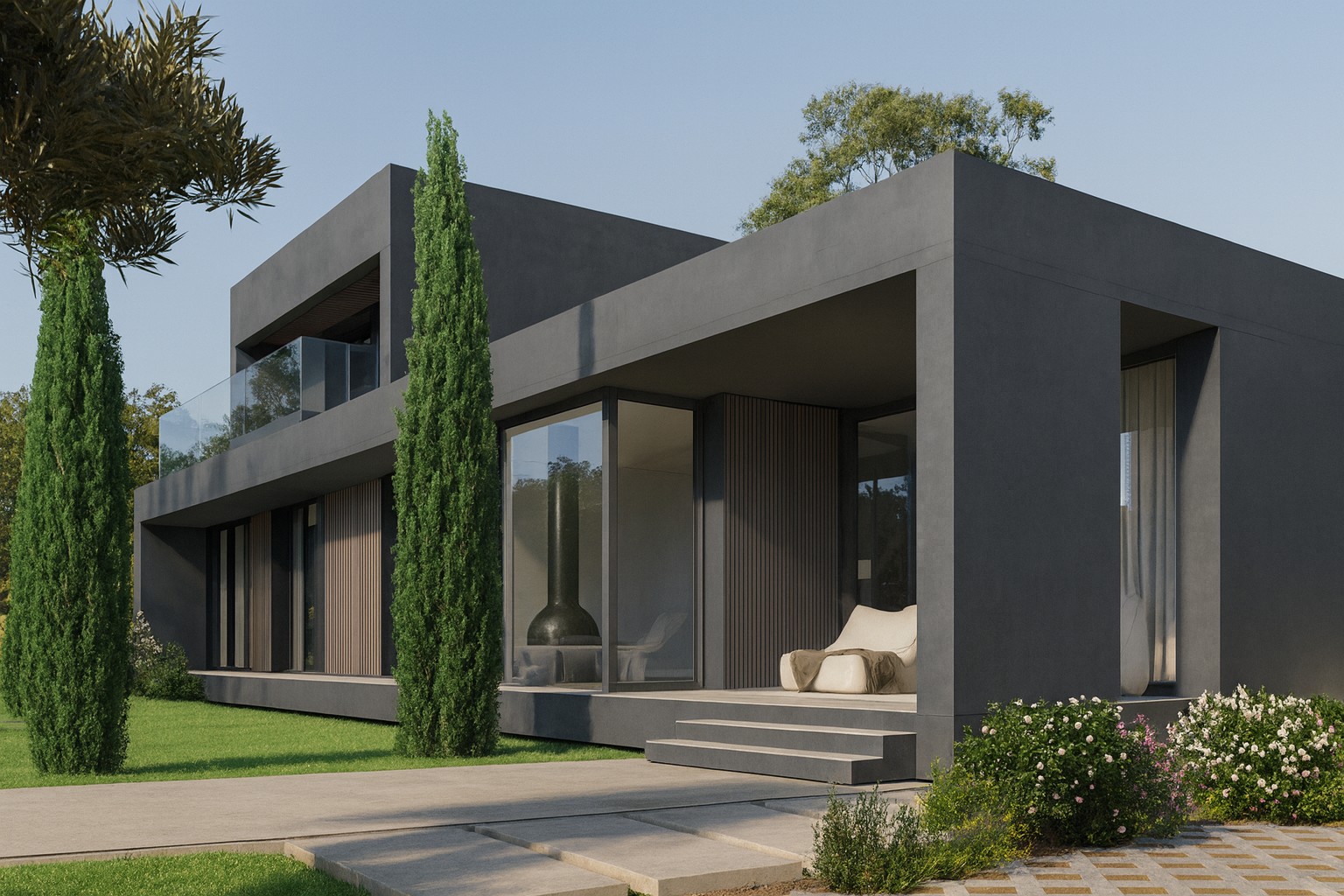 Перспективный проект, состоящий из комплекса мини-вилл, построенных по нашему дизайнерскому проекту, находящихся возле моря в пригороде Барселоны.